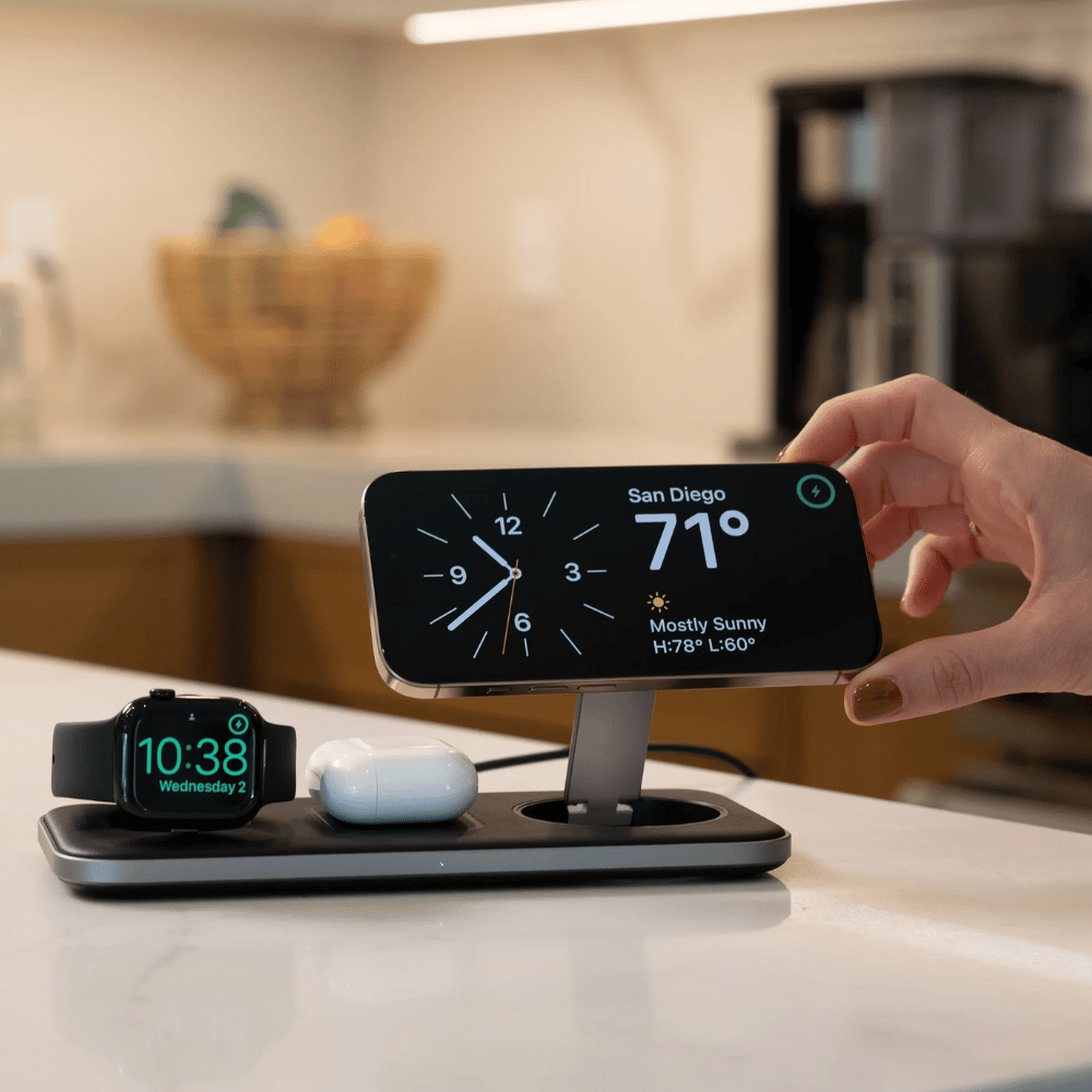 Qi2 Trio hỗ trợ sạc nhanh trên Apple Watch Series 7/8/9/10/Ultra/Ultra 2. Bản lề chắc chắn, bền bỉ của nó không bị yếu đi theo thời gian và được tối ưu hóa để hỗ trợ toàn bộ dòng iPhone hỗ trợ MagSafe.